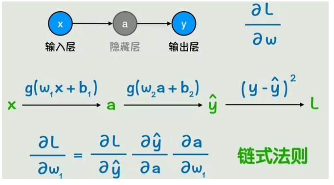 现在我们的问题就变成了如何求偏导数了。用一个简单的例子来说明。要求L对w1的偏导,只需要用链式法则分别求图中的三个偏导,再相乘就好了。而由于我们可以从右向左计算这些偏导数,然后调整每一层的参数,计算前一层的时候用到的偏导数的值,后面也会用到(更左边的层),所以可以让这些值从右向左传播,这个过程就叫做反向传播。