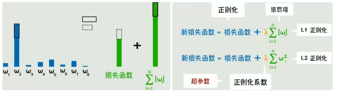 我们只需要在原来的损失函数的基础上加上被调整参数本身,这样当参数调整让损失函数减小的幅度甚至不如参数本身增大的幅度,新的损失函数就是增大的,这次调整显然就是不合适的(左图)。