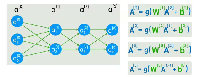 与此同时,当神经网络的层数越来越多的时候,也需要用合适的方法来表示。我们把输入层用a[0]表示,中间的层就用a[1]、a[2]来表示,以此类推。
