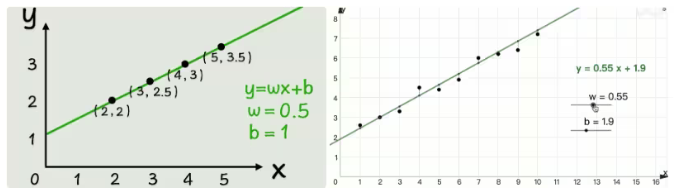 那么如何计算w和b呢?首先明确我们需要的w和b能够让函数的结果更接近真实数据。对于以下数据,我们可以看出显然第一个拟合的更好。
