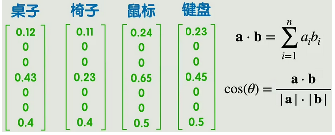 通过词嵌入的方式得到的词向量,维度不高不低,每个位置可以理解为一个特征值,但这个特征是通过训练得到的,我们并不知道代表着什么。那这种方式如何表示词与词之间的语义相关性呢?可以用两个向量的点积或余弦相似度来表示向量之间的相关性,进而表示词语之间的相关性。