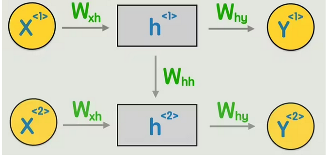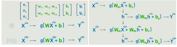 可以发现在第二个词的计算过程中,完全没有让第一个词的任何信息参与进来,怎么办呢?可以像右图这样,先输出一个隐藏状态,然后再经过一次非线性变换,得到输出Y。这就是循环神经网络RNN。