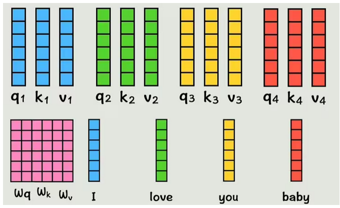 但是现在每个词中还不包括和其他词的关系,注意不到其他词的存在,所以我们用几个新矩阵Wq、Wk、Wv(训练得到)乘上每个词的词向量。当然,在计算机中运算时,是用Wq、Wk、Wv直接乘下方四个词向量拼成的大矩阵,然后直接得到三个矩阵(Q、K、V)。为了方便理解,还是拆分来看。