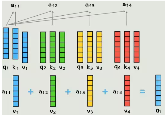 现在我们的词向量已经通过线性变换映射为了QKV,维度不变,现在我们让q1和k2做点积,代表第一个词和第二个词的相似度,同理类推,得到的系数再与v相乘,最后相加,得到的a1就是包含了全部上下文信息的第一个词的新词向量。