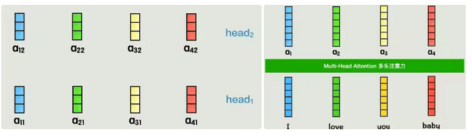 再次通过之前的运算得到a向量,拼接起来就得到了和之前一样的结构。我们刚刚的例子有两个头,也属于多头注意力。