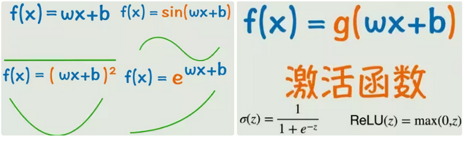 但是当数据稍微变化一下,出现曲线的时候,简单的线性函数就没办法解决这个问题了。那我们的目标就是将线性函数转为非线性函数,这可以通过套一个非线性函数来做到,比如平方、正弦函数、指数函数。这就是激活函数。