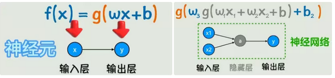 但这样看起来太复杂了,所以我们引入神经元的概念,图中的一个小圈就是一个神经元,多个神经元互相连接形成的网状结构就叫做神经网络。同时我们可以看到随着函数式子的嵌套,神经网络也在拓展,原本的输出成为了隐藏层:位于输入层和输出层之间的中间层。隐藏层的主要作用是对输入数据进行复杂的特征提取和变换,
