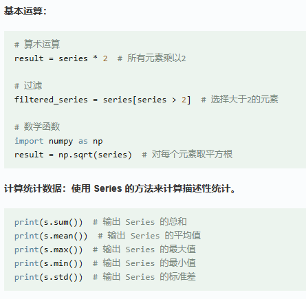 操作:Series支持各种操作,如数学运算、统计分析、字符串处理等。