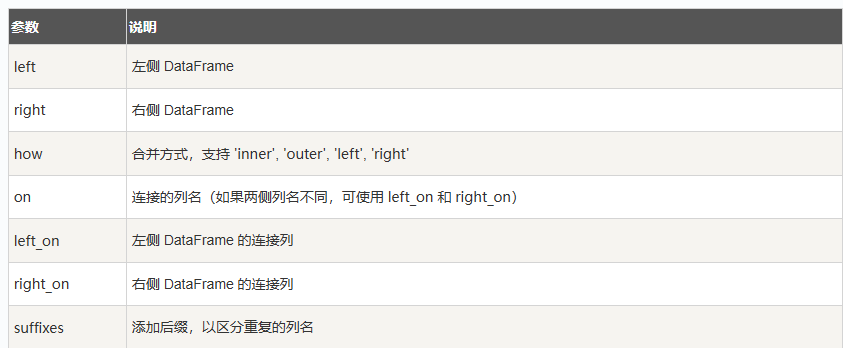 merge() 方法允许根据某些键值对两个 DataFrame 进行合并,类似SQL 中的 JOIN 操作。支持内连接(两个键值对的交集),外左连接和外右连接