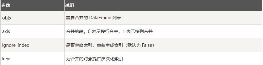 concat()用于将多个 DataFrame 沿指定轴(行或列)进行连接堆叠,常用于行合并(asix=0)或列合并()